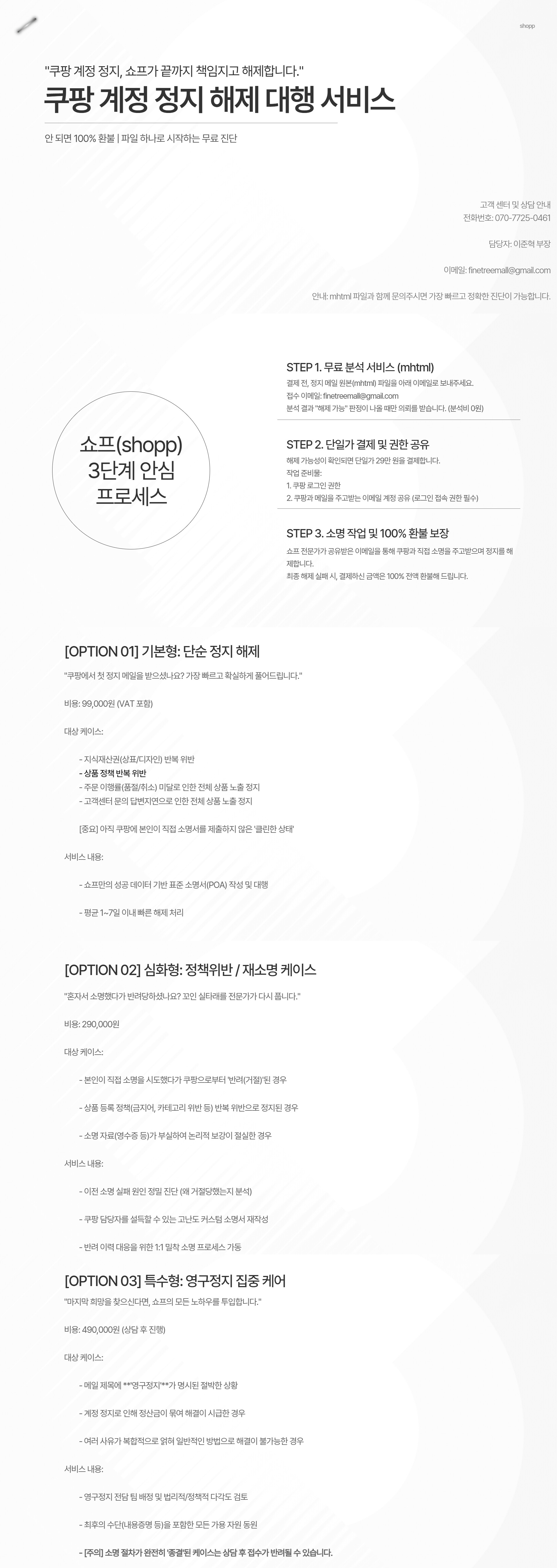 2.계정 권한 공유: 원활한 소명 작업을 위해 결제 완료 후 쿠팡 윙(Wing) 접속 권한 및 쿠팡과 메일을 주고받는 수신 이메일의 접속 권한 공유가 반드시 필요합니다.