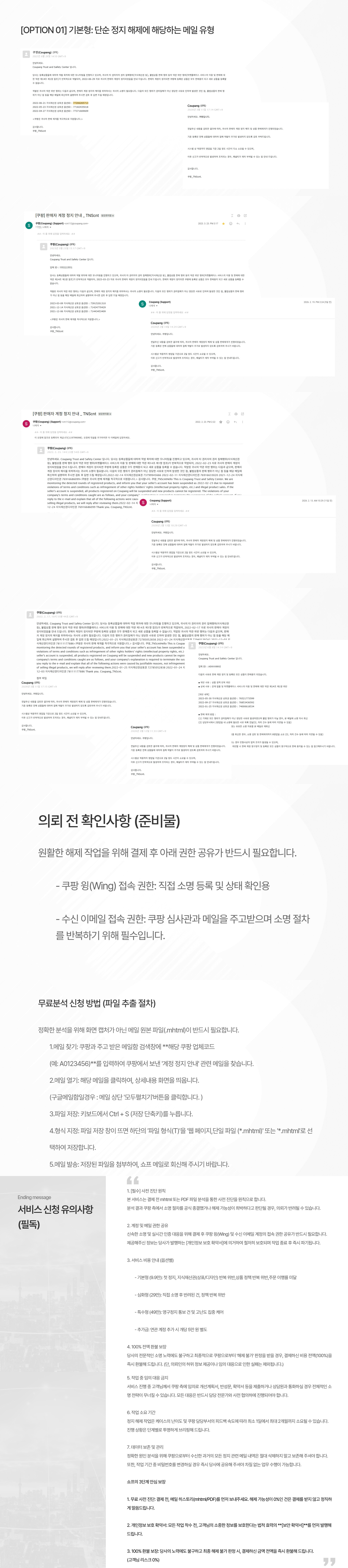 7.데이터 보존: 정확한 원인 분석을 위해 쿠팡으로부터 수신한 과거의 모든 정지 관련 메일 내역은 삭제하지 말고 보존해 주셔야 합니다.