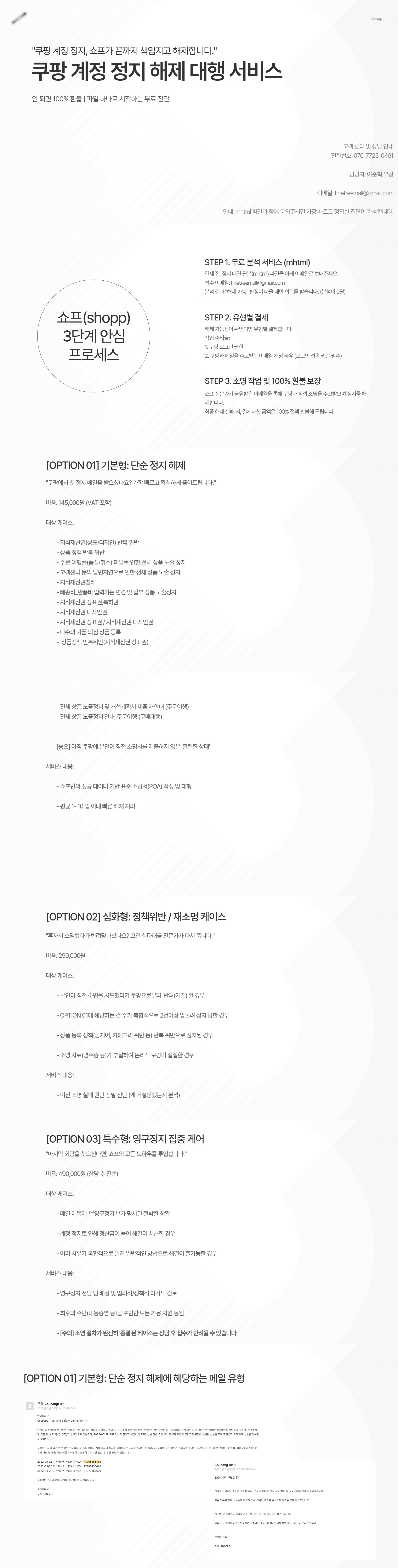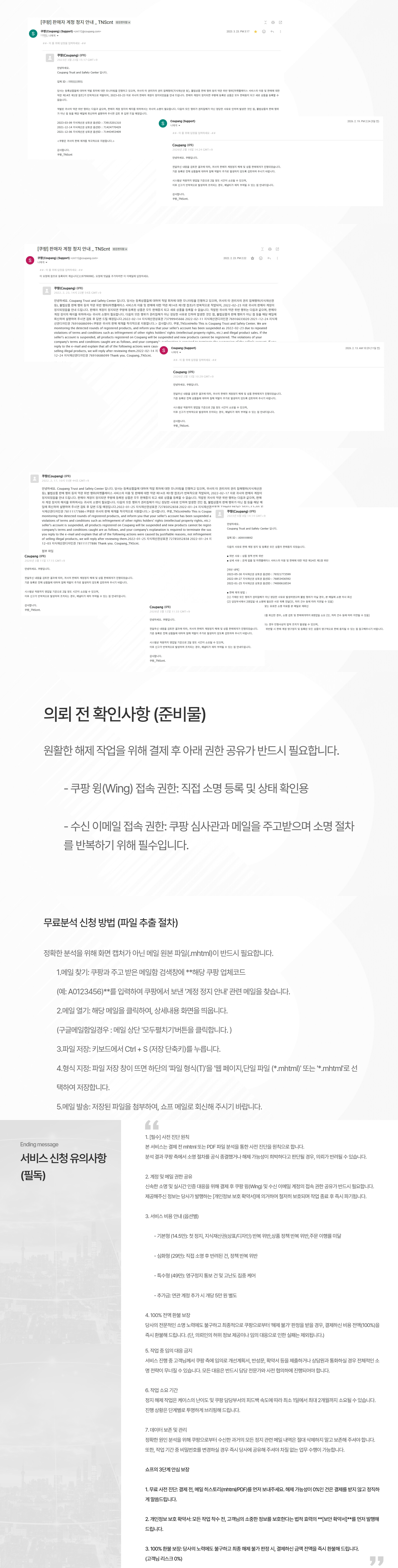 2.계정 권한 공유: 원활한 소명 작업을 위해 결제 완료 후 쿠팡 윙(Wing) 접속 권한 및 쿠팡과 메일을 주고받는 수신 이메일의 접속 권한 공유가 반드시 필요합니다.