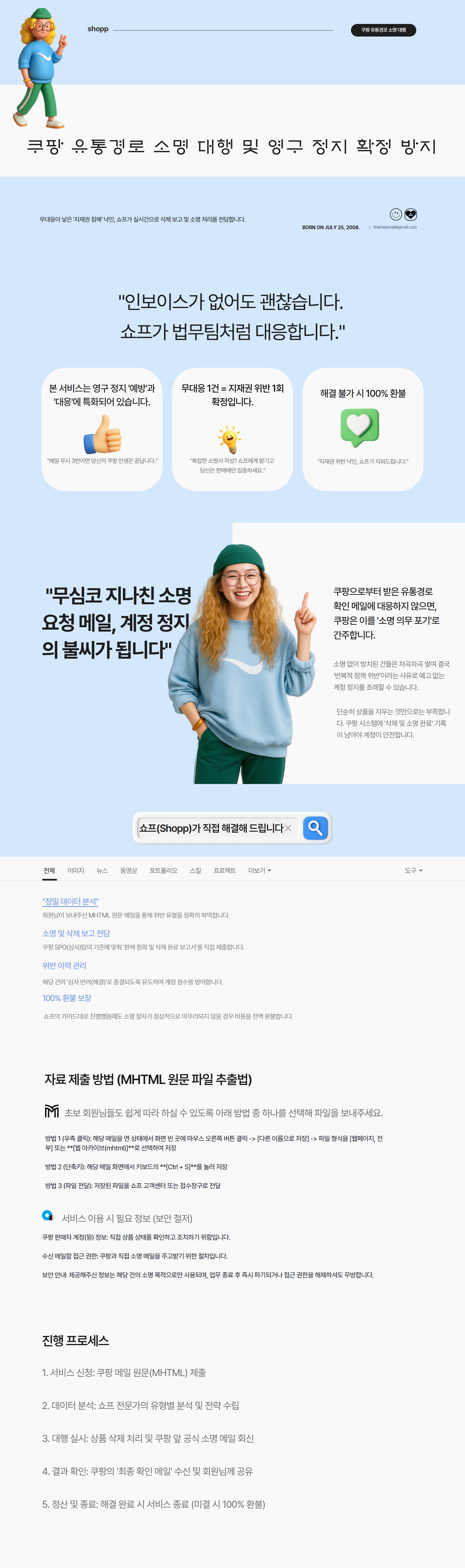 본 서비스는 쿠팡으로부터 '소명 요청 메일'을 받은 직후 신청하시는 것을 권장합니다. 쿠팡이 제시한 소명 기한이 이미 경과한 건에 대해서는 구제 가능성이 낮아질 수 있으며, 이로 인한 불이익은 당사가 책임지지 않습니다.